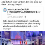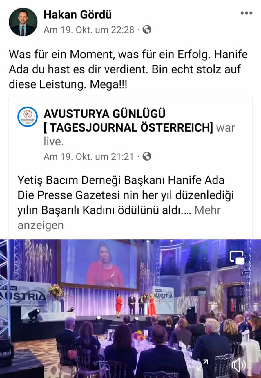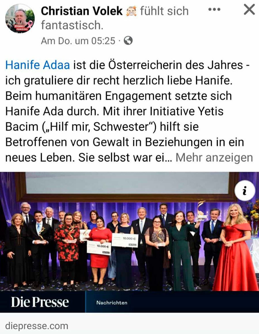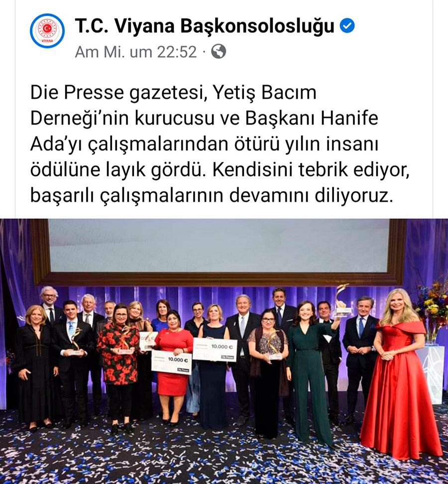 Hanife Ada wurde Österreicherin des Jahres 2022 Mit dieser hohen Anerkennung können wir noch besser helfen.Vielen Dank! Einige Impressionen: Video WIEN – Postfach yetisbac@gmail.com +43 (0) 699 177 81 768